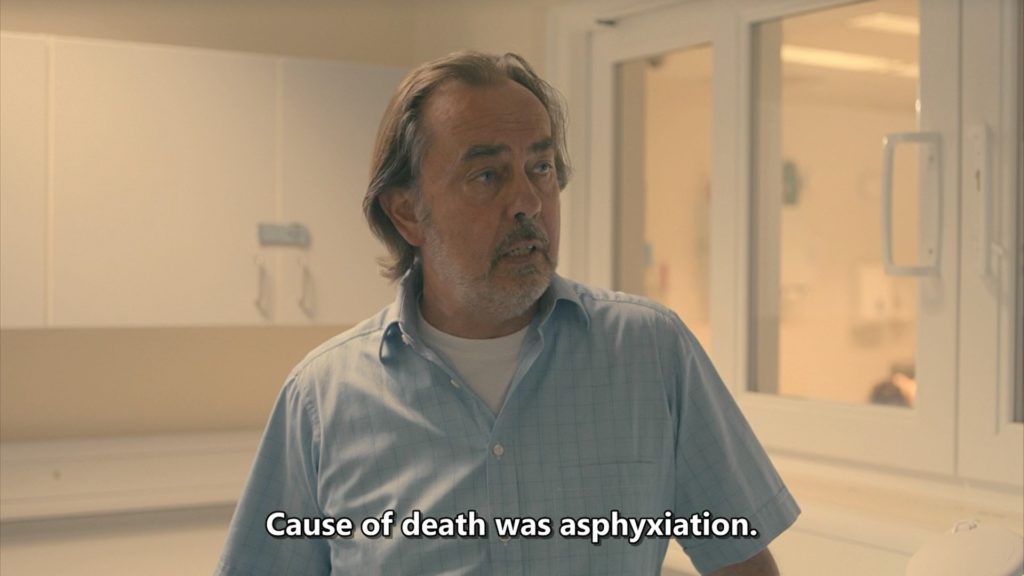 Судмедэксперт (scenes of crime officer — SOCO, forensics, forensic scientist or expert) опровергает версию самоубийства (suicide, killing yourself, dutch act) ребенка, заявив, что смерть подозрительная (suspicious death). Патологоанатом (pathologist, medical examiner) назвал причиной смерти жертвы (victim) удушение (strangulation, suffocation, asphyxiation).
